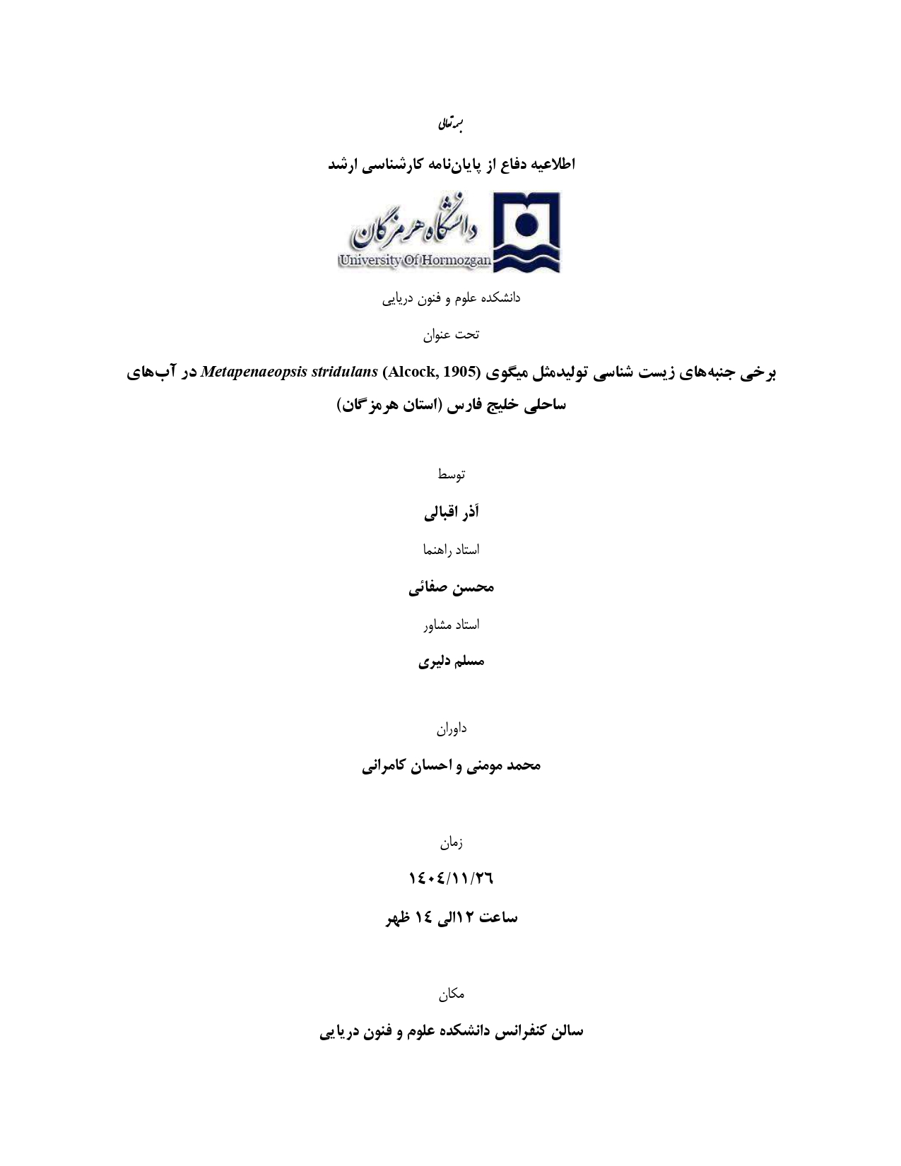 اطلاعیه دفاع از پایان نامه کارشناسی ارشد خانم آذر اقبالی